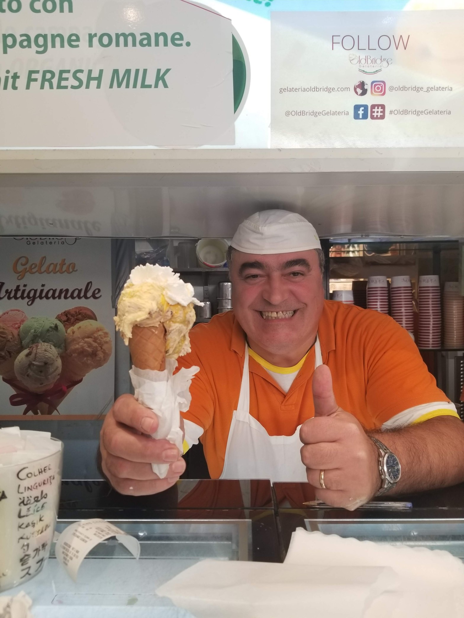 When visiting a gelateria I decide whether or not I’m going to order from them based on the coloring of their flavors – particularly the banana and pistachio flavors, avoiding any shop with unnatural coloring. The banana color should not be bright yellow and the pistachio color should be light brown with only the slightest hint of green as shown below in my cone from Old Bridge Gelateria…